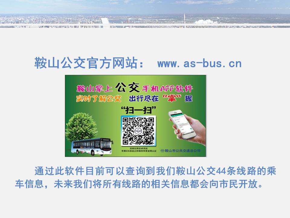 點(diǎn)點(diǎn)手機(jī)就可以看到公交車目前所在的位置,精準(zhǔn)地掐好出門時間,從而避免在惡劣天氣或高峰期苦苦候車,工作人員坐在調(diào)度室內(nèi)就能掌握車輛在路上的運(yùn)行情況……為方便廣大市民出行,基于安卓平臺開發(fā)的“鞍山掌上公交”官方APP將于11月15日正式上線試運(yùn)行,適用于蘋果IOS系統(tǒng)的APP將于明年初上線,市民可在公共交通總公司官網(wǎng)下載該軟件,并實(shí)現(xiàn)37條公交線路車輛實(shí)時查詢的便利服務(wù)。 近年來,市公交總公司借助“互聯(lián)網(wǎng)+公交”發(fā)展理念,以創(chuàng)建國家低碳環(huán)保示范城市為契機(jī),大力推進(jìn)智能公交建設(shè),目前已在56條公交線路實(shí)現(xiàn)了GPS調(diào)度指揮,可實(shí)現(xiàn)車輛實(shí)時監(jiān)控,運(yùn)營趟次查詢、行車計(jì)劃查詢、超速查詢等29項(xiàng)報(bào)表查詢分析功能,極大地提高了車輛利用率及企業(yè)管理科學(xué)化水平。智能公交的廣泛應(yīng)用不但讓市民出行更加便捷,也讓公交從業(yè)人員的工作更輕松。